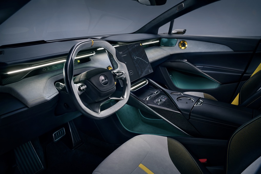 That extra length in the body, and the lack of a conventional engine and transmission, mean the Lotus has enough space for a family of four. There is the choice of a five seater or four seats and a more luxurious feel, with a centre console between the passengers that houses extra technology and storage.